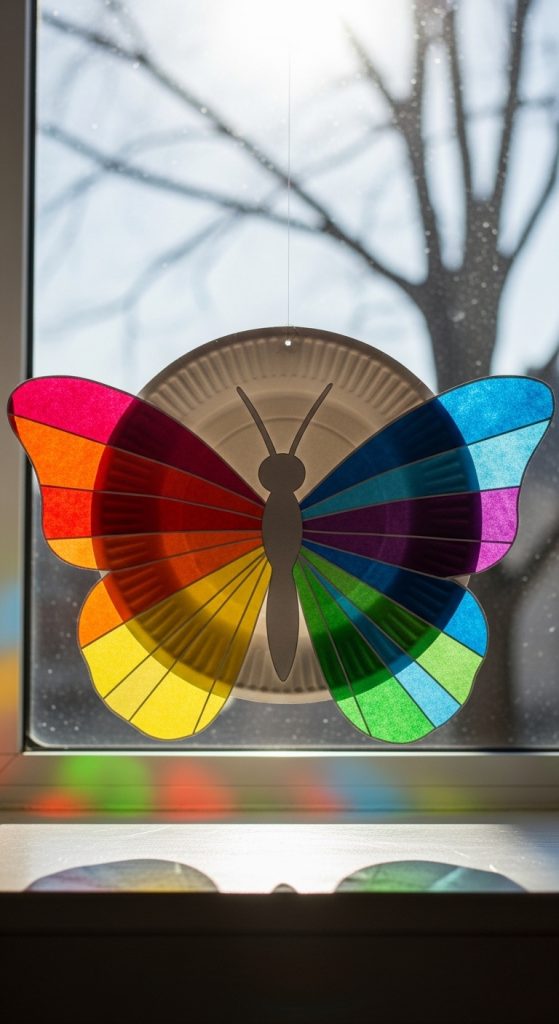 These look stunning when the light shines through them. By cutting out the center of a paper plate, you create a “frame” for a colorful, translucent wing design.