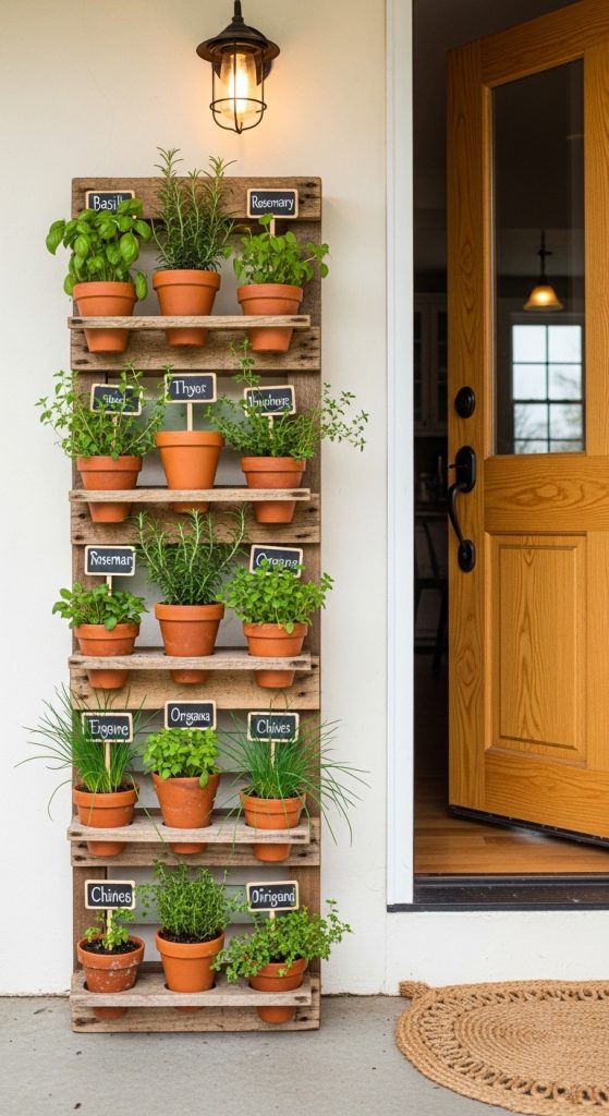 Turn a pallet into a dedicated herb garden for your kitchen needs. Attach small pots or use the pallet slots to plant herbs like mint, basil, and parsley. Place it near your kitchen door for easy access while cooking.