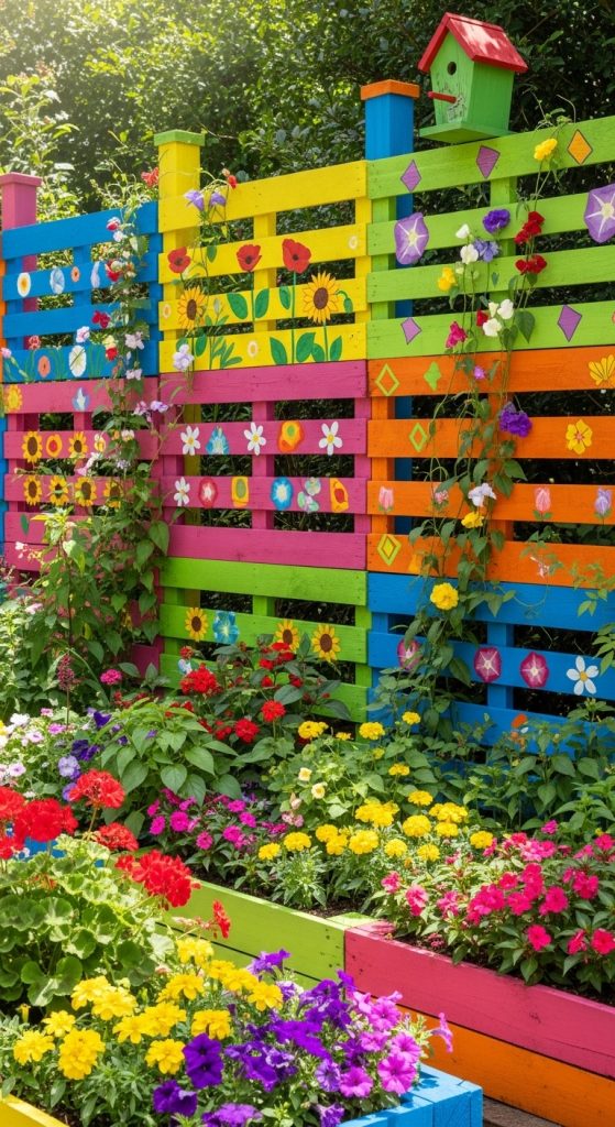 Create a simple and stylish fence using pallets. This is perfect for defining your garden area or protecting plants from pets. You can paint the fence in bright colors to make your garden more lively and inviting.
