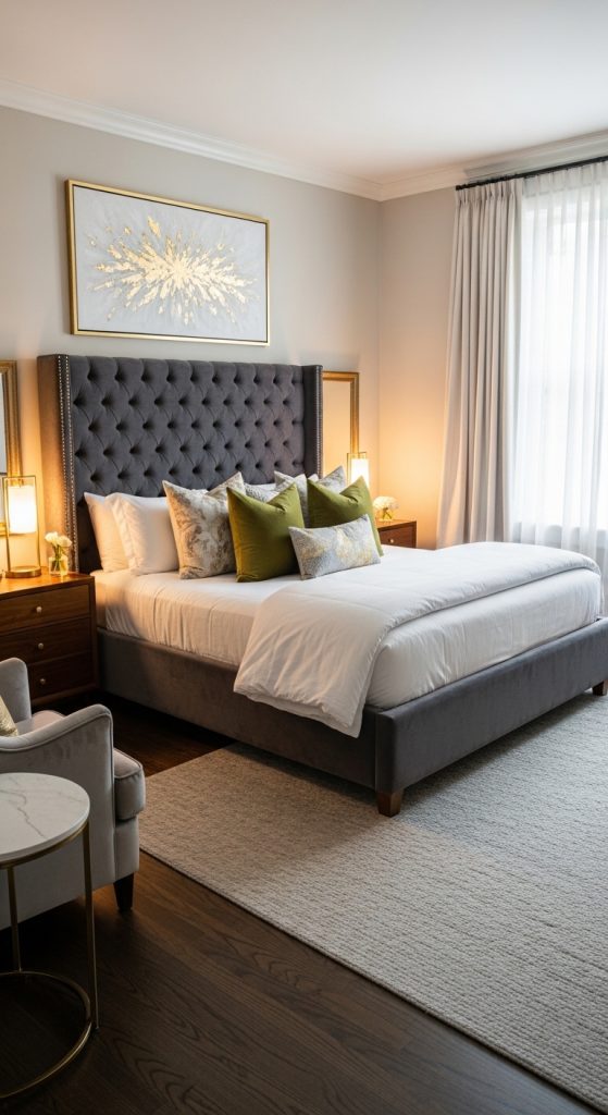 Bring the elegance of a five-star hotel into your home. Invest in high-quality bedding, plush pillows, and a statement headboard. Add soft lighting, velvet textures, and metallic accents like gold or silver. A neutral color palette with hints of luxury creates a sophisticated and comfortable space.