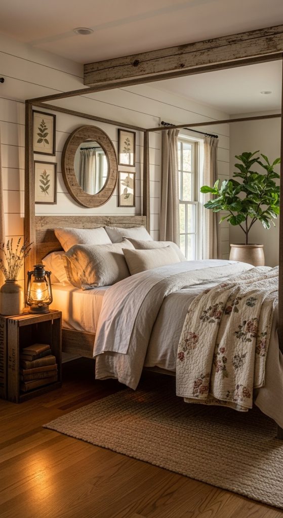 A rustic farmhouse bedroom brings warmth and comfort. Use wooden furniture, vintage décor, and soft neutral colors. Add cozy blankets, woven rugs, and antique-style lamps. This style creates a welcoming and homey atmosphere that feels timeless.