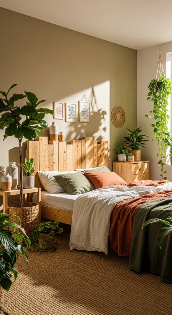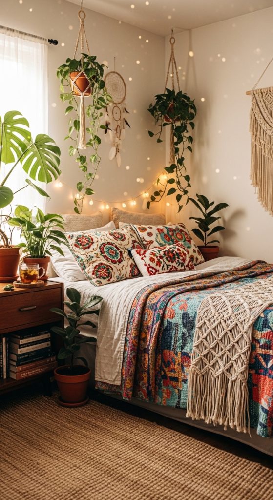 A bohemian bedroom is perfect for those who love a relaxed and artistic vibe. Layer your bed with colorful blankets, textured pillows, and soft throws. Add macramé wall hangings, indoor plants, and warm lighting. This style is all about mixing patterns and embracing individuality while maintaining a cozy feel.