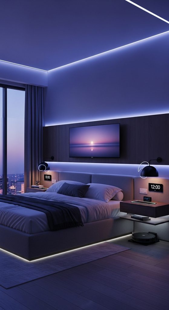 Upgrade your bedroom with modern technology. Smart lighting, automated curtains, and voice-controlled devices can enhance comfort and convenience. Add LED lights for ambiance and create a futuristic yet cozy environment tailored to your lifestyle.