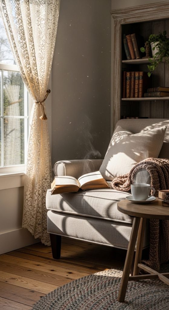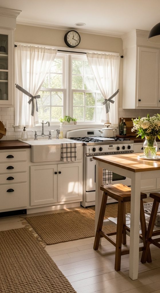 Café curtains cover only the lower half of the window, allowing sunlight to enter while maintaining privacy. They are ideal for kitchens and bathrooms. Choose simple fabrics or subtle patterns to keep the farmhouse look clean and inviting.