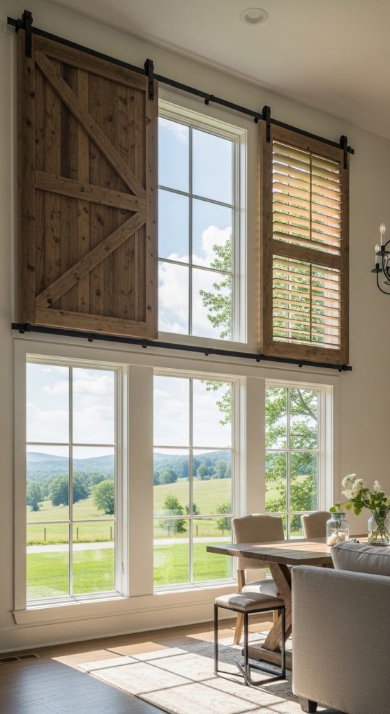 For a bold farmhouse statement, consider sliding barn door shutters. These are perfect for large windows or patio doors. They not only provide privacy but also act as a unique design feature that enhances the rustic charm of your home.