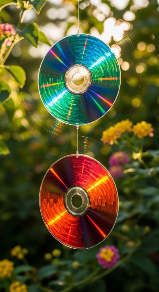 Don’t throw away old, scratched CDs! Their reflective surface is perfect for scaring away birds from your vegetable patch while looking beautiful in the sun.