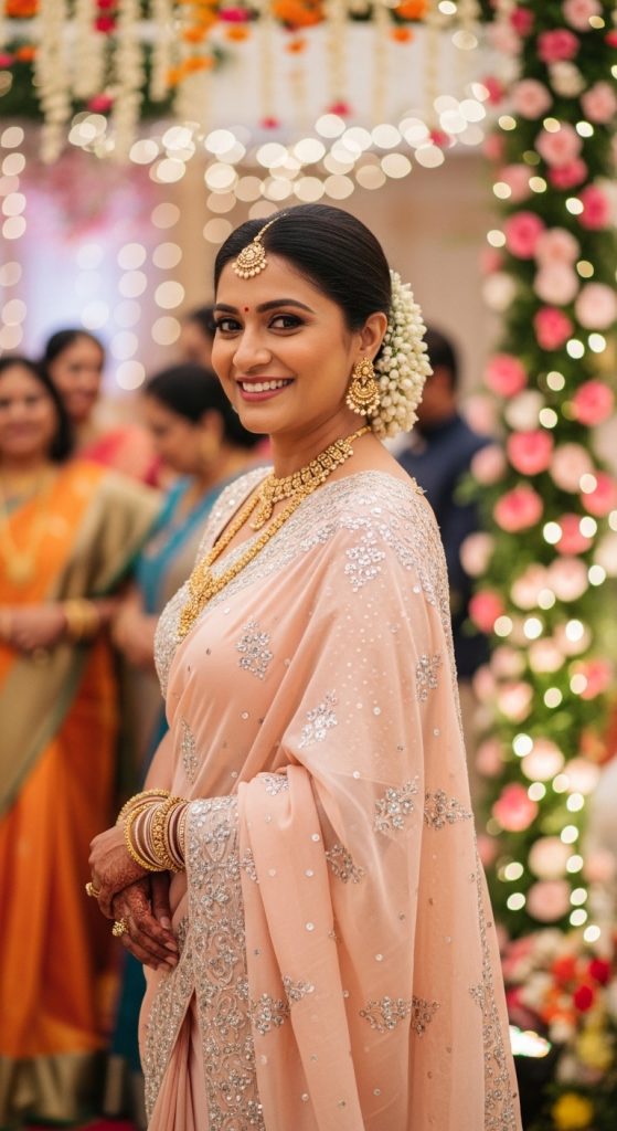 For a traditional and graceful appearance, a saree is always a beautiful option. Choose lightweight fabrics like chiffon or georgette for comfort. Modern blouse designs or subtle embellishments can elevate the look while keeping it wedding-appropriate.