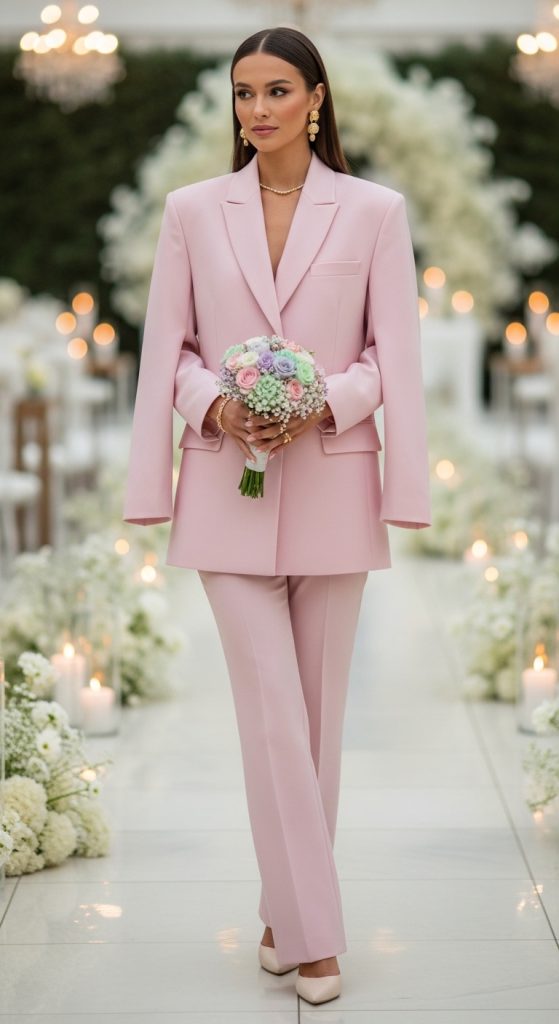 A tailored suit is a powerful and modern choice. Whether it’s a pastel pantsuit or a bold monochrome look, this outfit is perfect for contemporary weddings. Pair it with heels and statement earrings to add a feminine touch.