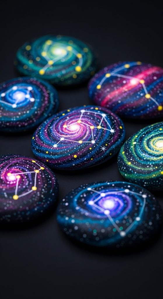 Create a magical effect by painting galaxy designs on rocks. Use dark colors like black, navy blue, and purple as the base, then add white dots and swirls to represent stars and galaxies. This idea is visually stunning and gives a cosmic feel to your creations.