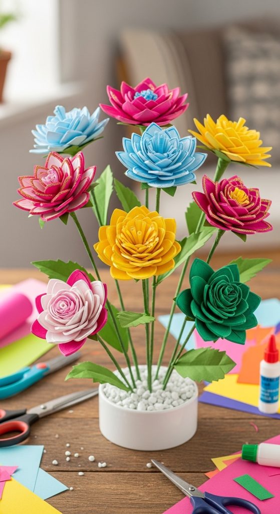Make beautiful flowers by cutting and shaping paper rolls into petals. Paint them in bright colors and attach them to stems made from straws or sticks. These flowers can be used as home décor or as handmade gifts.
