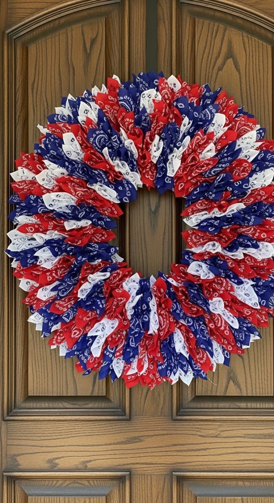 This is one of the easiest and most budget-friendly crafts. It uses red, white, and blue bandanas to create a full, fluffy wreath that is perfectly “Country Chic.”