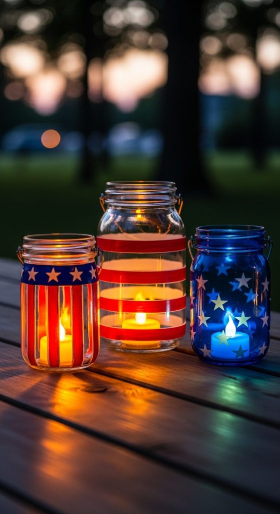 • Materials: Mason jars, painter’s tape, red/white/blue paint, tea lights.