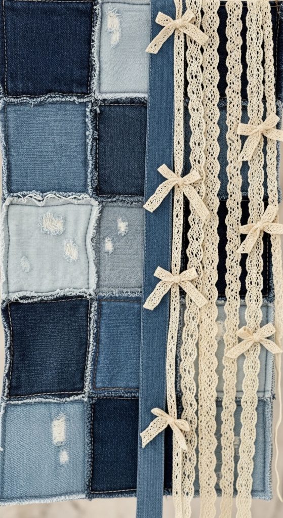 If you have old jeans, this upcycling project is for you. The mix of rugged denim and delicate white lace creates a beautiful “Shabby Chic” American flag.