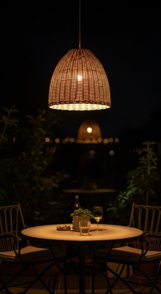 If you have a covered patio that gets sun at the edges, a basket pendant is a great way to add warmth. It looks like an expensive rattan fixture from a high-end furniture store.