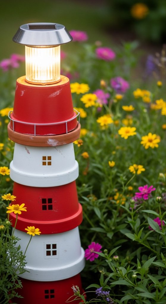 This is a fun, architectural project that adds height to your flower beds. It uses graduated terra cotta pots to create a coastal-themed lighthouse with a solar “beacon” at the top.
