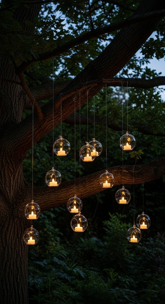 Turn your backyard trees into an enchanted forest. By placing solar lights inside glass globes or geometric terrariums, you create “floating” lights that charge by day and sparkle by night.