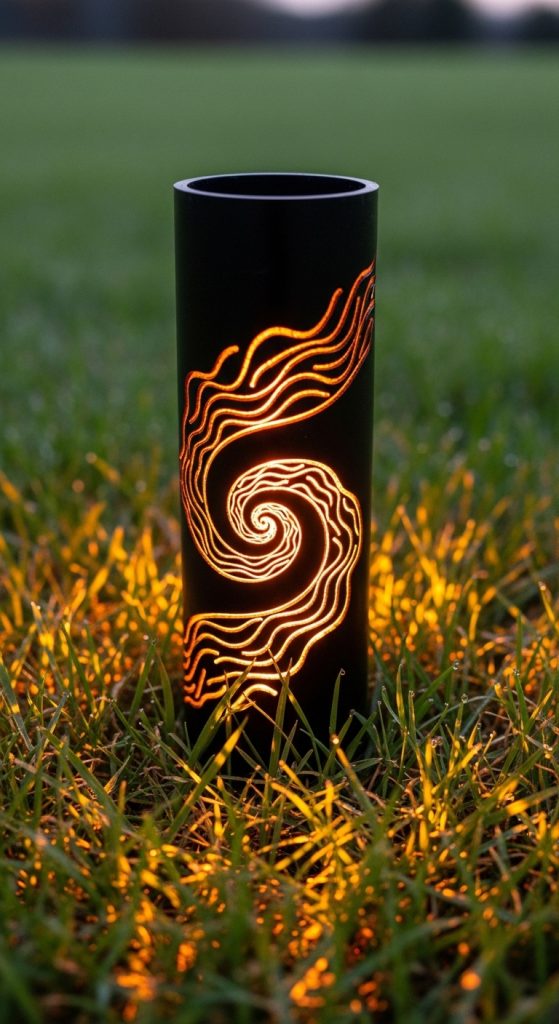 This is a sleek, industrial-style project. When the solar light is placed inside a carved PVC pipe, it casts beautiful, intricate shadows on your patio or grass.