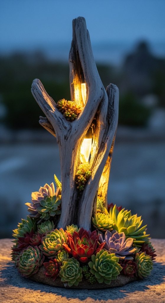 • Materials: A large piece of driftwood, a drill with a spade bit, solar stake lights.