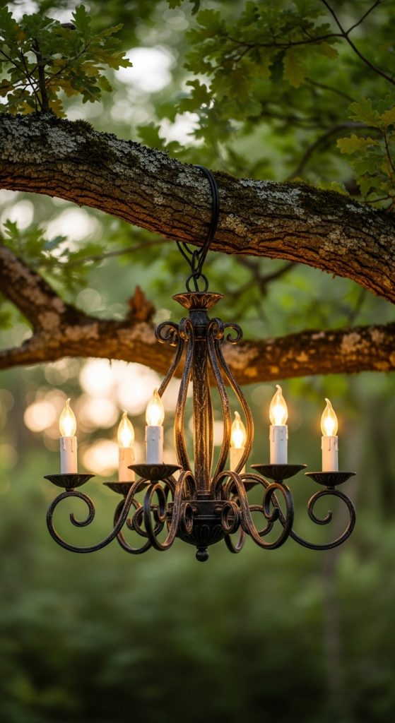 • Materials: Old metal chandelier, 4–6 solar stake lights.