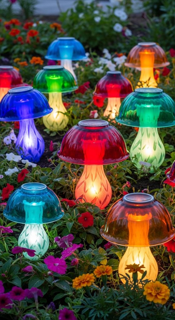 Using colorful glass bowls and vases, you can create whimsical “mushrooms” that glow from the inside. This is a great way to add a pop of color to shady garden corners.