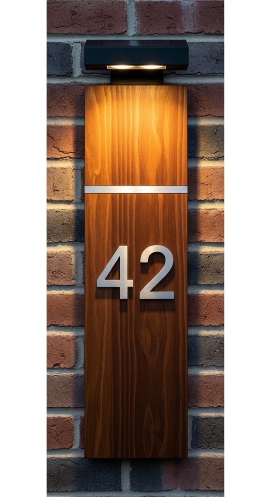 • Materials: Wooden plaque, modern house numbers, solar “gutter” light.
