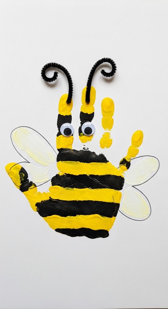 This craft is perfect for toddlers. The handprint becomes the body of a large, friendly bumblebee that “flies” across the page.
