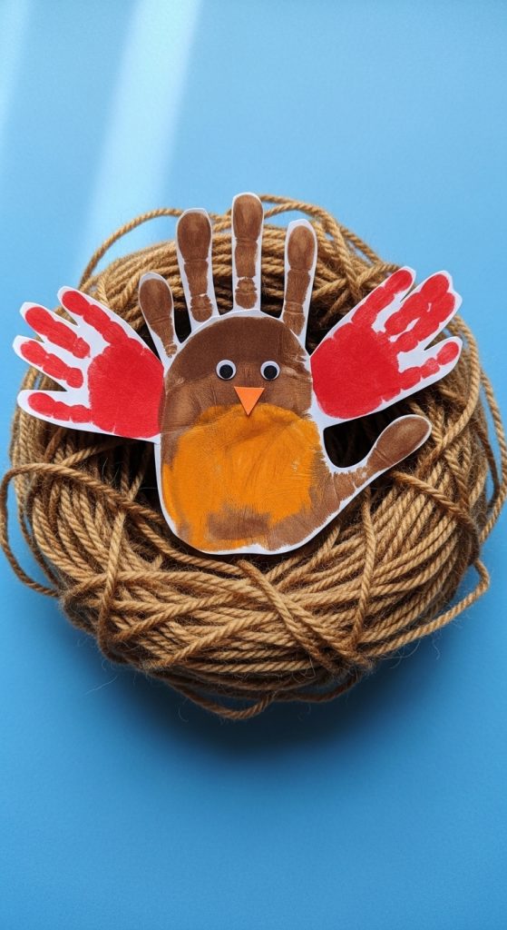 - Glue scraps of brown yarn at the bottom of the handprint to create a textured nest.
