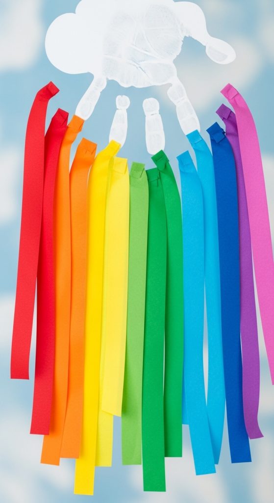 This is a high-color craft that brightens up any room. The handprint becomes the fluffy cloud that holds up a beautiful spring rainbow.