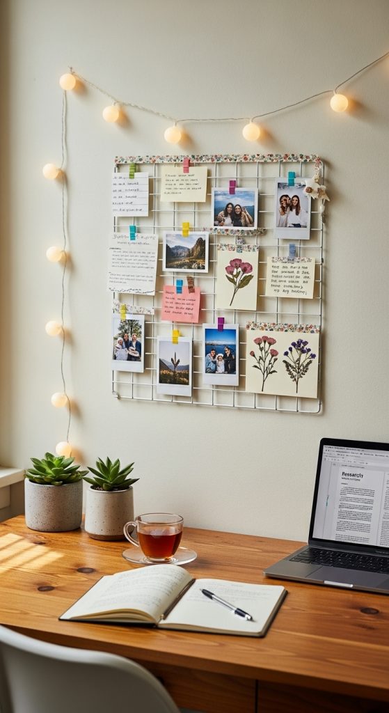 Use washi tape to create a grid pattern on your wall. Inside each section, you can place notes, pictures, or small prints using clips or adhesive. This idea is perfect for students or creatives who want a functional yet aesthetic wall setup.