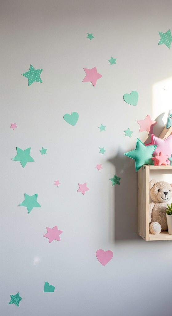 Design fun shapes like hearts, stars, mountains, or even abstract art using washi tape. This idea is especially great for kids’ rooms or playful interiors. You can change the shapes whenever you want, making it a flexible décor option.